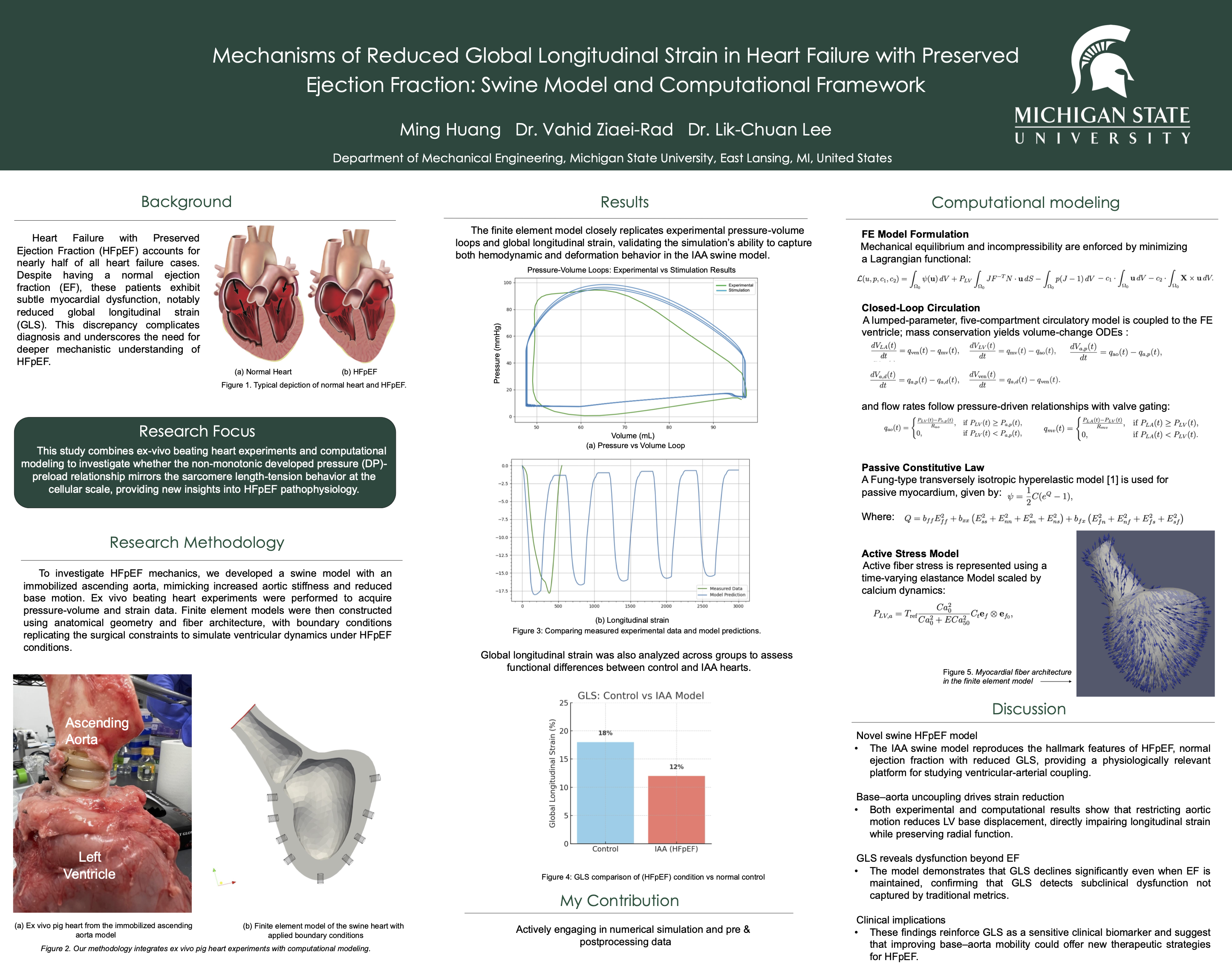 This project investigates the mechanisms underlying reduced global longitudinal strain in heart failure with preserved ejection fraction, a condition where patients exhibit normal ejection fraction despite impaired myocardial function.