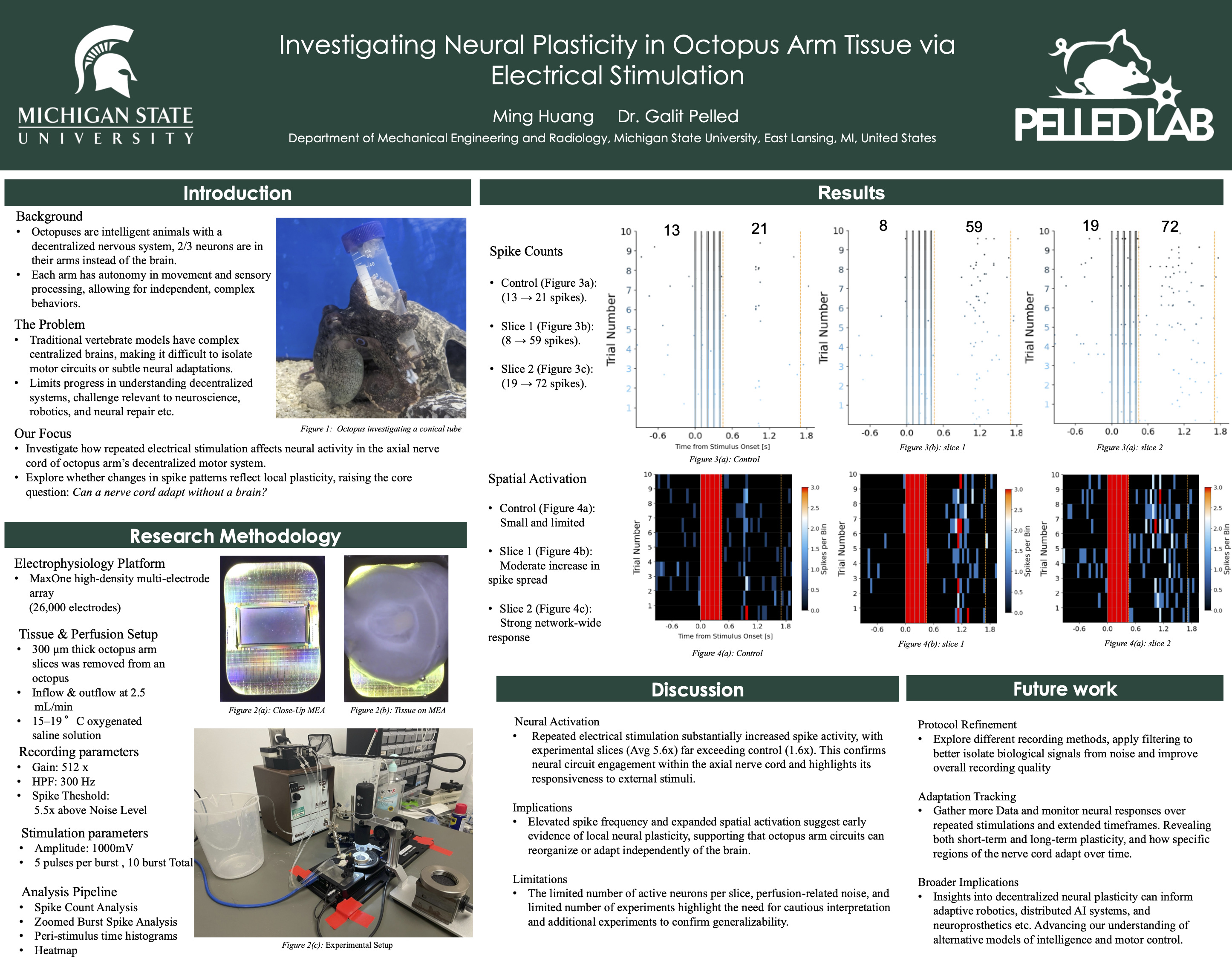 This research investigates how repeated electrical stimulation affects neural activity in isolated octopus arm tissue. Octopus arms contain a highly decentralized nervous system, making them a unique model for studying local neural plasticity independent of a central brain. Using high-density electrophysiology recordings, we examined whether repeated stimulation leads to increased spike activity and expanded spatial activation within the axial nerve cord.